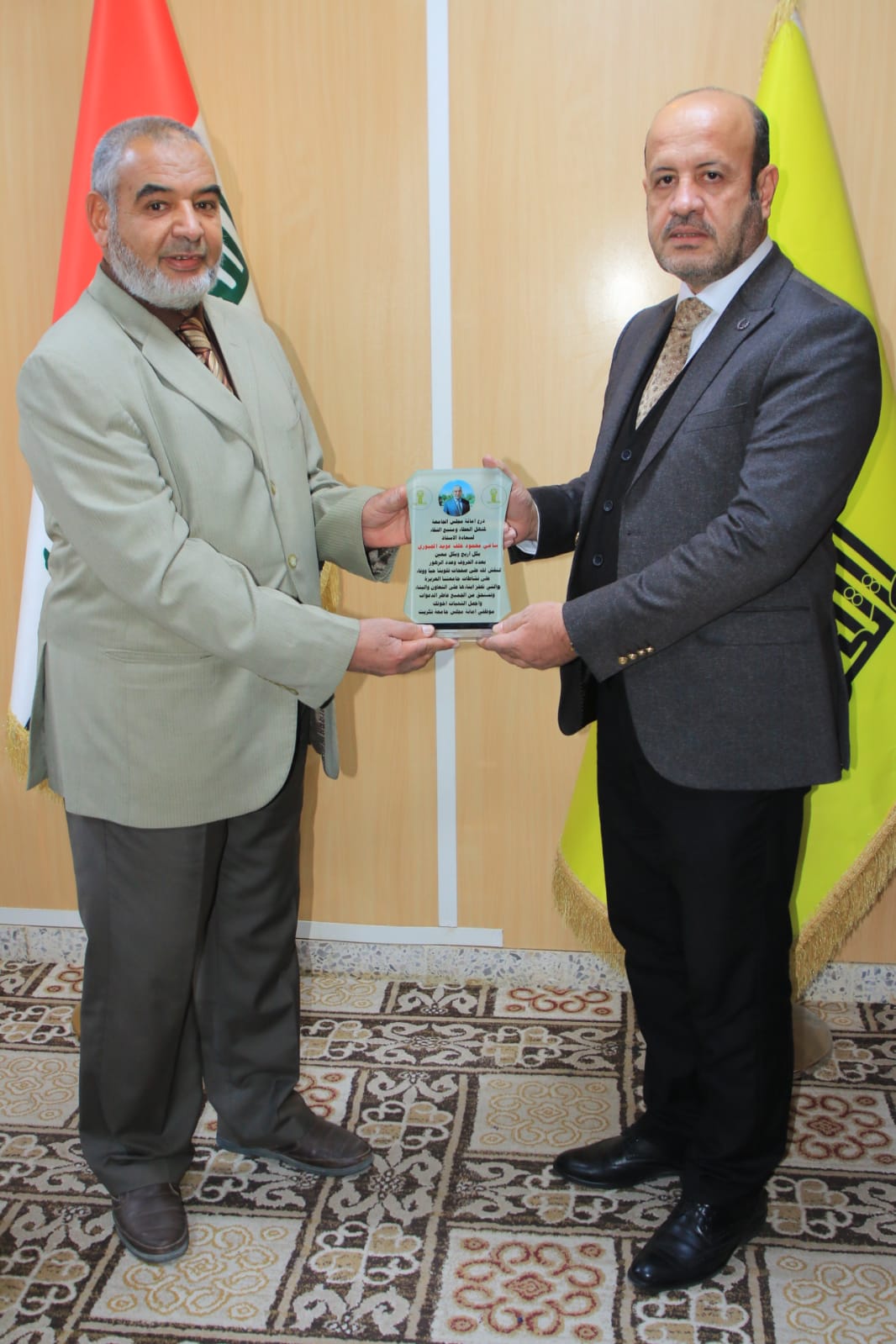 كرم الاستاذ الدكتور وعد محمود رؤوف رئيس جامعة تكريت السيد سامي محمود خلف الموظف على ملاك رئاسة جامعة تكريت لبلوغه السن القانوني اذ تم تكريمه بكتاب شكر وتقدير تثمينا لتفانيه واخلاصه في العمل خلال مدة خدمته التي اتسمت بتحمل المسوؤلية والامانة ، وقال السيد رئيس الجامعة خلال التكريم " اننا اليوم نودع خيرة موظفينا ولايسعنا الا نشكر الخدمة الجليلة التي قدمتها لهذه الجامعة خلال مسيرتك الطويلة ستترك فراغا بيننا لكنك ستبقى في قلوب الجميع مثالا حقيقاً لتفانيك واخلاصك اتمنى لك الموفقية ".