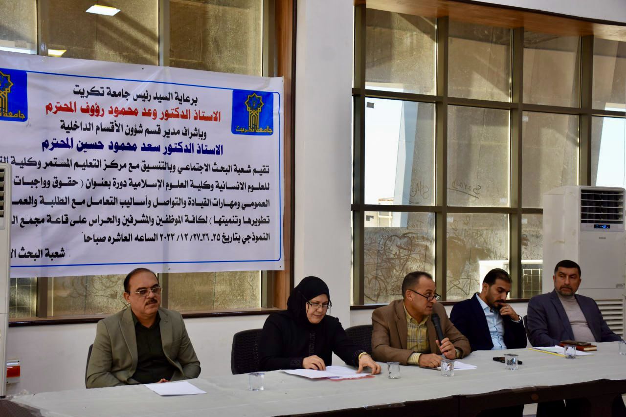 برعاية رئيس جامعة تكريت الاستاذ الدكتور وعد محمود رؤوف المحترم وبإشراف مدير قسم شؤون الاقسام الداخلية الاستاذ الدكتور سعد محمود حسين المحترم، اقامت شعبة البحث الاجتماعي صباح اليوم الاثنين الموافق 25/12/2023 وبالتعاون مع مركز التعليم المستمر وكلية التربية للعلوم الانسانية قسم العلوم التربوية والنفسية دورة تطويرية عن حقوق وواجبات الموظف في مجمع الطالبات النموذجي. حاضر فيها كل من ا.م.د. عامر مهدي صالح، ا.د. أوان كاظم عزيز والحقوقي محمد ضياء غناوي هدفت الدورة إلى محاولة تطوير أداء الموظفين من خلال زيادة معرفة الموظف بواجباته وحقوقه التي يتمتع بها اثناء خدمته الوظيفية. وتطرقت الدورة الى حقوق الموظف وما يتضمن من قوانين لحمايته والتعريف بيها لغرض تسهيل الاعمال والحفاظ على كرامته كذلك تم توضيح واجبات الموظف في ظل قانون موظفي الدولة العراقية وما يترتب عليه من اجراءات قانونية في حالة الاخلال بهذه الواجبات.