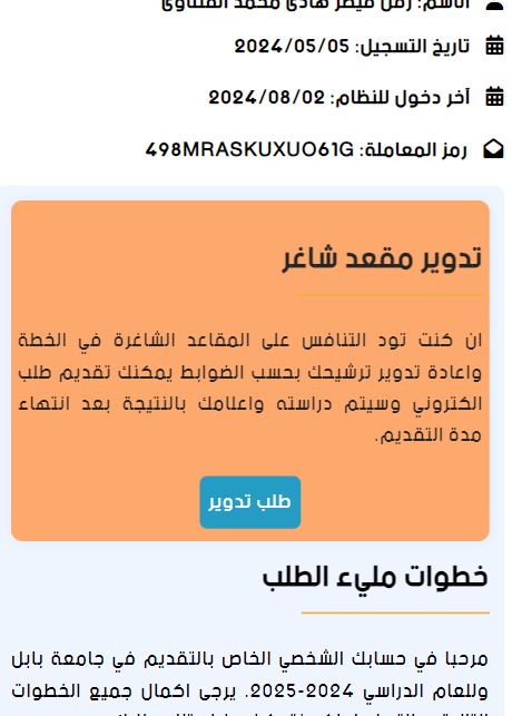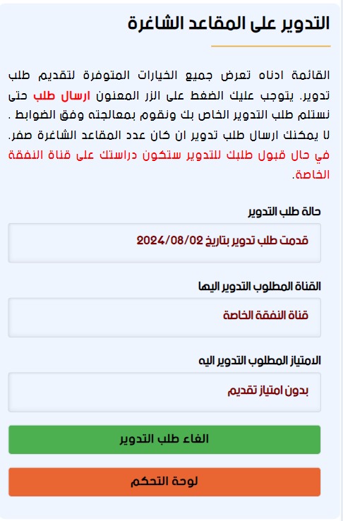 انطلقت خدمة ارسال طلب تدوير الى المقاعد الشاغرة في خطة القبول للعام الدراسي 2024-2025 والتي تسمح للمتقدمين على قنوات القبول العام والخاص والناجحين بالامتحان التنافسي بالتدوير لشغل مقعد شاغر سواء في العام او الخاص او الامتيازات. عند قبول التدوير سيكون المقعد المخصص للطالب المقبول على النفقة الخاصة ويتحمل اجور الدراسة , غير مسموح لذوي الامتيازات بارسال طلبات تدوير , المتقدمين الراسبين بالامتحان التنافسي غير مسموح لهم ارسال طلبات تدوير،وبعد ارسال طلب تدوير يرجى الانتظار لغاية 7-8 لمعرفة نتيجة معالجة طلب التدوير.