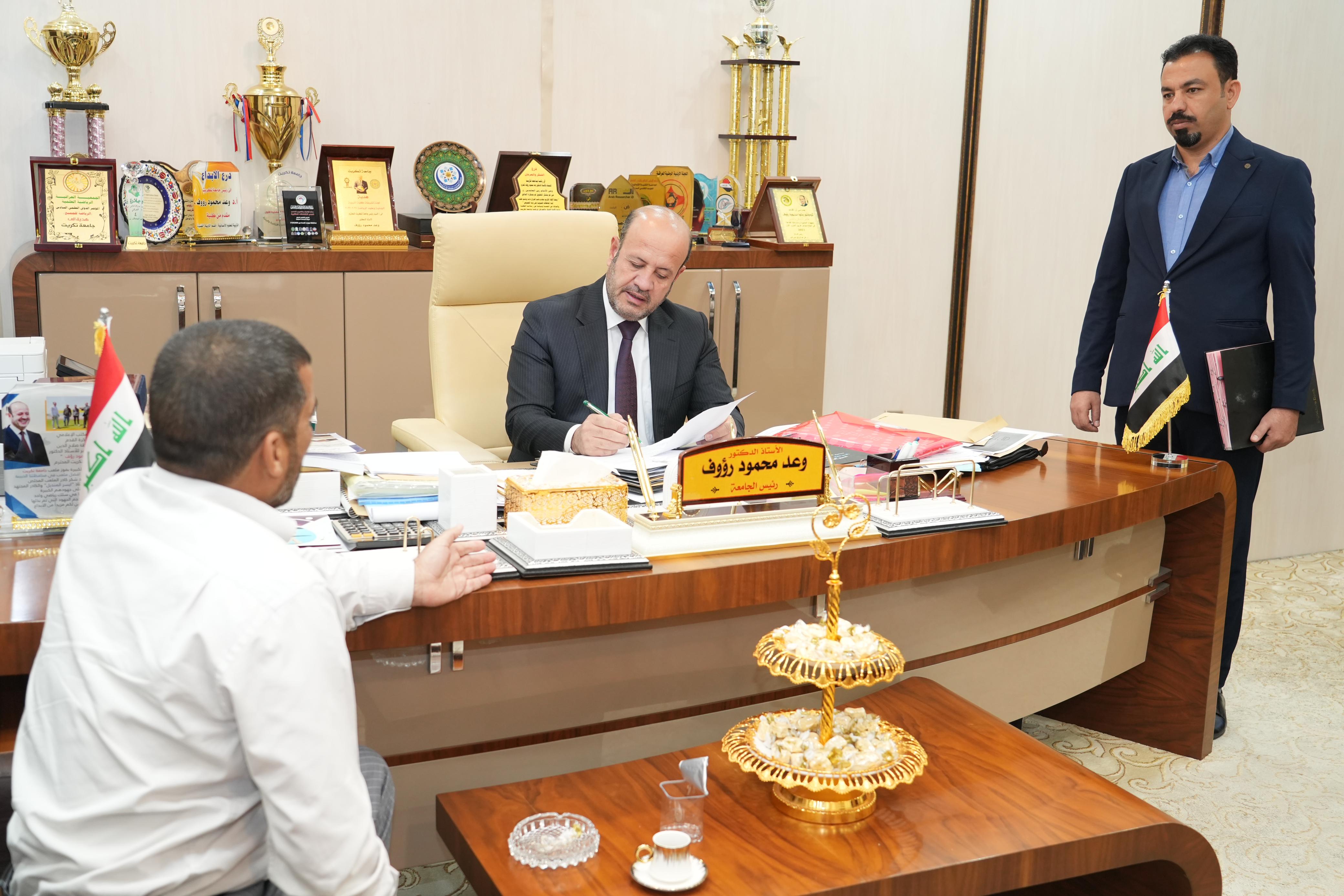 ضمن برنامج المقابلات الاسبوعي لرئيس الجامعة عبر استمارة المقابلات التي وضعتها شعبة شؤون المواطنين التقى الاستاذ الدكتور وعد محمود رؤوف رئيس جامعة تكريت اليوم الثلاثاء الموافق ٢/ ٧/ ٢٠٢٤ في مكتبه عدداً من الطلبة ومنتسبي الجامعة والمواطنين في اطار المتابعة الدائمة والمستمرة لاحتياجات منتسبي وطلبة الجامعة والمواطنين حيث استمع رئيس الجامعة الى احتياجاتهم ومشاكلهم ووجه الجهات ذات العلاقة بتذليل جميع العقبات وفق الاطر القانونية وضمن توجيهات وزارة التعليم العالي والبحث العلمي