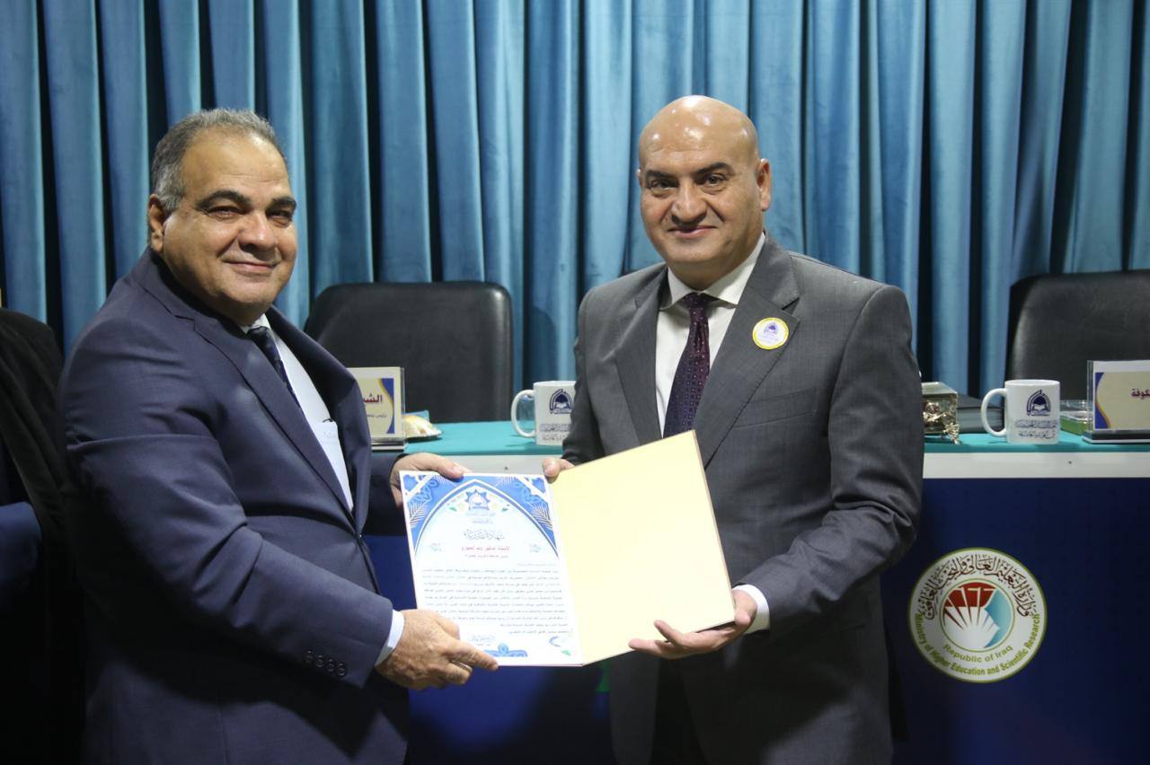 وقد استلم شهادة التقدير نيابةً عن السيد رئيس الجامعة الأستاذ الدكتور حسن حسين إبراهيم، مساعد رئيس الجامعة للشؤون العلمية، الذي حضر فعاليات الملتقى ممثلًا عن السيد رئيس جامعة تكريت، مؤكدًا خلال حضوره أهمية هذه اللقاءات العلمية في توحيد الجهود الأكاديمية، وتعزيز الشراكات المؤسسية، وترسيخ روح التعاون المشترك بما يسهم في خدمة التنمية الفكرية والثقافية في البلاد.