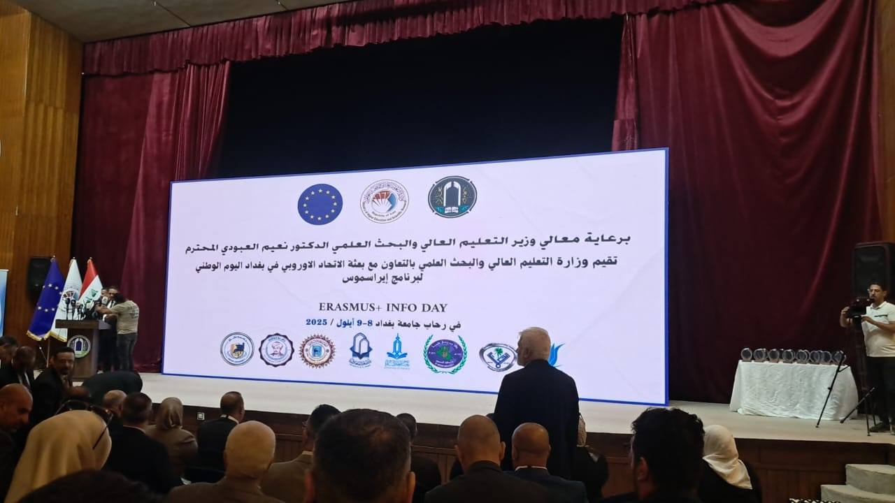 برعاية وحضور معالي وزير التعليم العالي والبحث العلمي الدكتور نعيم العبودي، نظّمت وزارة التعليم العالي والبحث العلمي بالتعاون مع بعثة الاتحاد الأوربي في بغداد فعاليات اليوم الوطني لبرنامج (+Erasmus) في رحاب جامعة بغداد للمدة من 8 إلى 9 أيلول 2025.