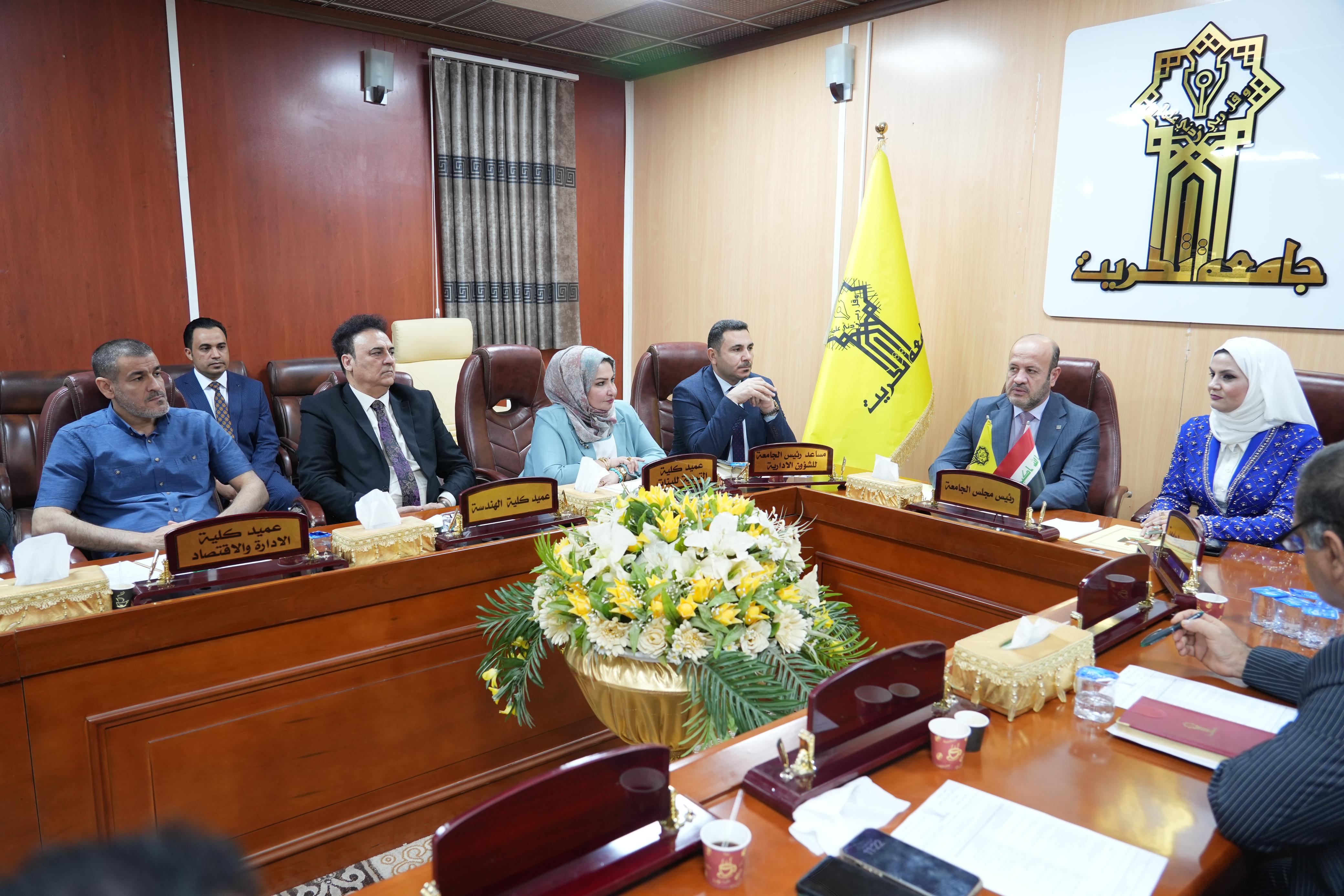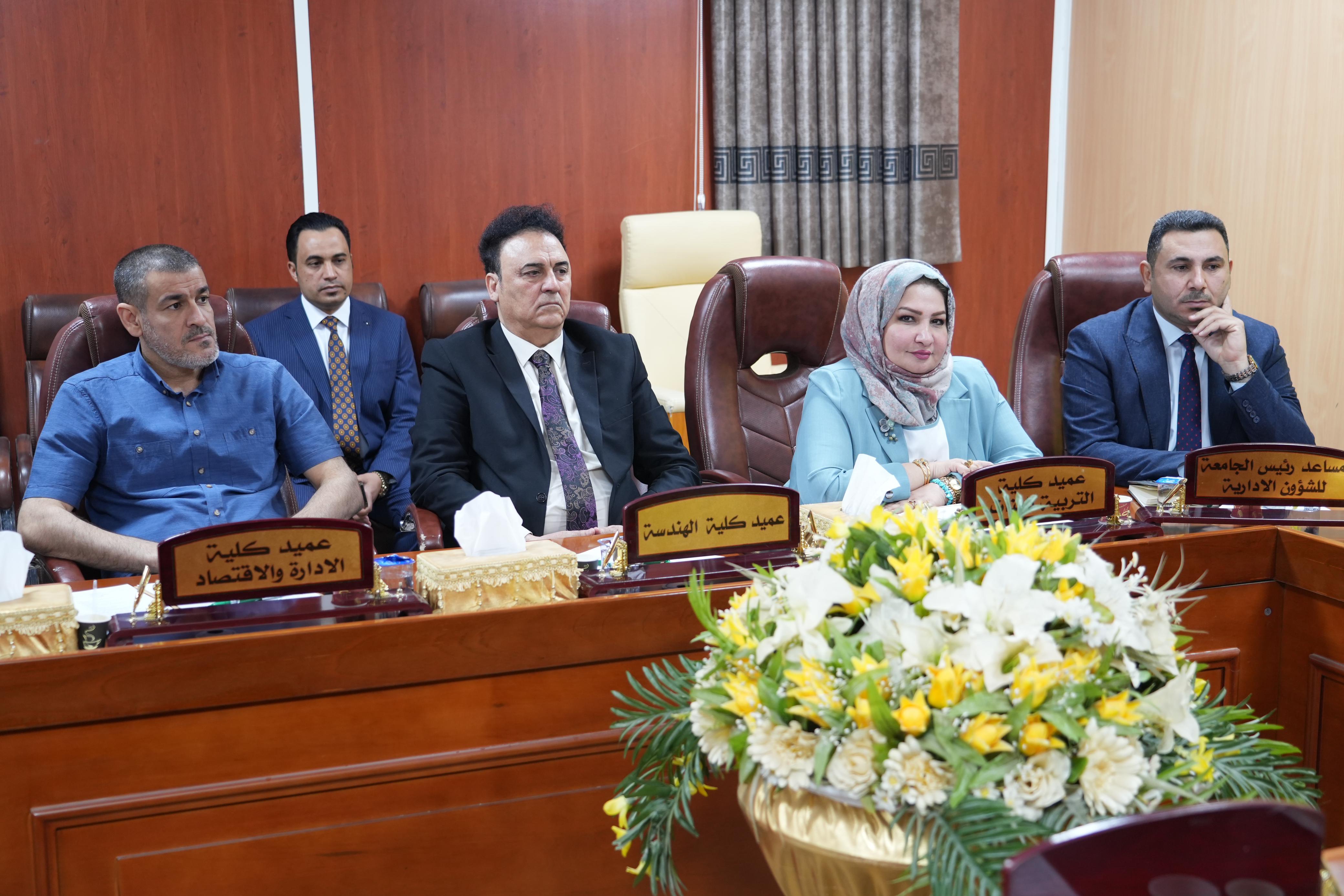 ترأس الاستاذ الدكتور وعد محمود رؤوف رئيس جامعة تكريت الجلسة التاسعة لمجلس الجامعة وبحضور السادة اعضاء المجلس اليوم الثلاثاء الموافق ١٦/ ٤/ ٢٠٢٤ افتتحت الجلسة بعد ترحيب السيد رئيس الجامعة بالسادة الحاضرين بأعطاء بعض التوجيهات الخاصة بسير العمل ناقش المجلس بعدها الفقرات المدرجة على جدول أعماله والتي كان من اهمها اعفاء اجور دراسية/ دراسات اولية/ موازي ودراسة مسائية وتخفيض اجور دراسية لطلبة دراسات عليا وترقيات علمية وتوصيات المؤتمر الوطني الاول للتعليم الاخضر بالاضافة الى استحداث دراسة مسائية/ قسم التفسير وعلوم القرآن وتصحيح اجازة دراسية وتمويل وتشغيل محطة تربية الاسماك وتمويل وتشغيل محطة ابحاث ابحاث بيجي الزراعية واحلال اعضاء في المكاتب الاستشارية كذلك تمت مناقشة العديد من الفقرات الاخرى المدرجة على جدول اعمال المجلس.