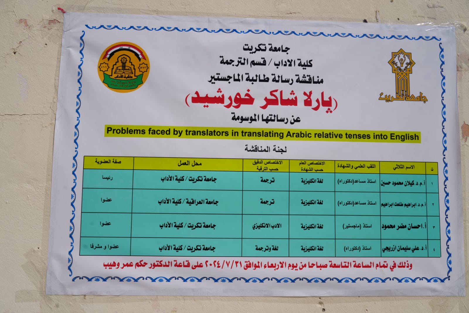 تنفيذا لتوجيهات الاستاذ الدكتور وعد محمود رؤوف رئيس جامعة تكريت وضمن الجولات التفقدية والمتابعات المستمرة لكليات واقسام ومفاصل الجامعة حضر الاستاذ الدكتور حسن حسين ابراهيم مساعد رئيس الجامعة للشؤون العلمية مناقشة رسالة ماجستير في كلية الاداب قسم الترجمة للطالبة (پارلا شاكر خورشيد ) ، واثنى مساعد رئيس الجامعة على جهود الطالبة والاستاذ المشرف وثمن دور الاساتذة اعضاء لجنة المناقشة وملاحظاتهم الدقيقة التي اكدت المستوى العلمي الرصين للجامعة