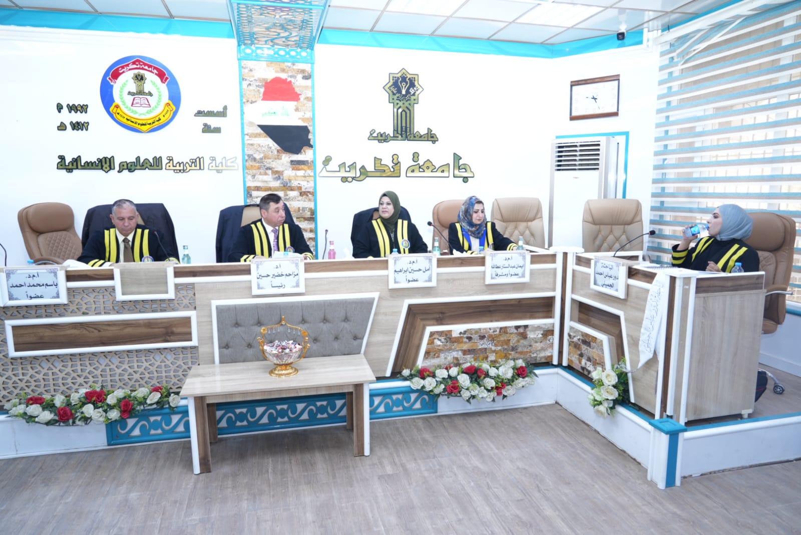 تنفيذا لتوجيهات الاستاذ الدكتور وعد محمود رؤوف رئيس جامعة تكريت وضمن الجولات التفقدية والمتابعات المستمرة لكليات واقسام ومفاصل الجامعة حضر الاستاذ المساعد الدكتور حسن حسين ابراهيم مساعد رئيس الجامعة للشؤون العلمية مناقشة رسالتي ماجستير الاولى للطالبة بدور عباس احمد عبد الله الجميلي من قسم التربية الفنية والثانية للطالبة هدى جاسم محمد كلية التربية للعلوم الانسانية قسم اللغة الانكليزية