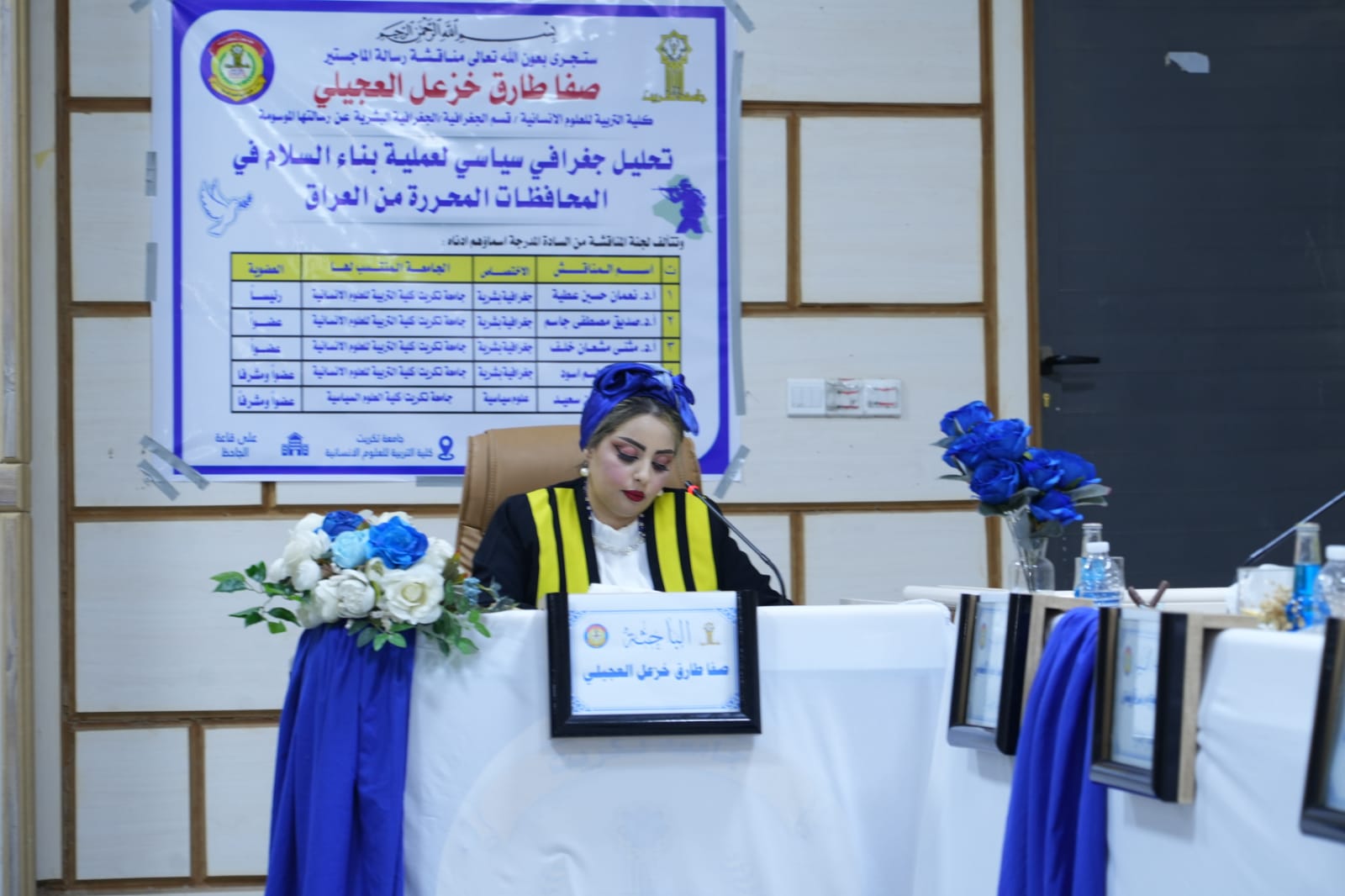 حضر الاستاذ الدكتور وعد محمود رؤوف رئيس جامعة تكريت اليوم الخميس الموافق 2/5/2024 وضمن الجولات التفقدية والمتابعات المستمرة لكليات واقسام ومفاصل الجامعة مناقشة رسالة ماجستير في قسم الجغرافية بكلية التربية للعلوم الانسانية للطالبة (صفا طارق خزعل ) عن رسالتها الموسومة ( تحليل جغرافي سياسي لعملية بناء السلام في المحافظات المحررة من العراق) وقد بارك رئيس الجامعة الجهود المبذولة من قبل الطالبة والاستاذ المشرف والاساتذة المناقشين واثنى على الدقة العلمية للملاحظات العلمية التي طرحتها لجنة المناقشة وصوابها وثمن المستوى العلمي الرصين لهذه المناقشة التي تصب هي ومثيلاتها في تحقيق الرصانة العلمية والاكاديمية التي تليق بجامعة تكريت كصرح علمي واكاديمي كبير .