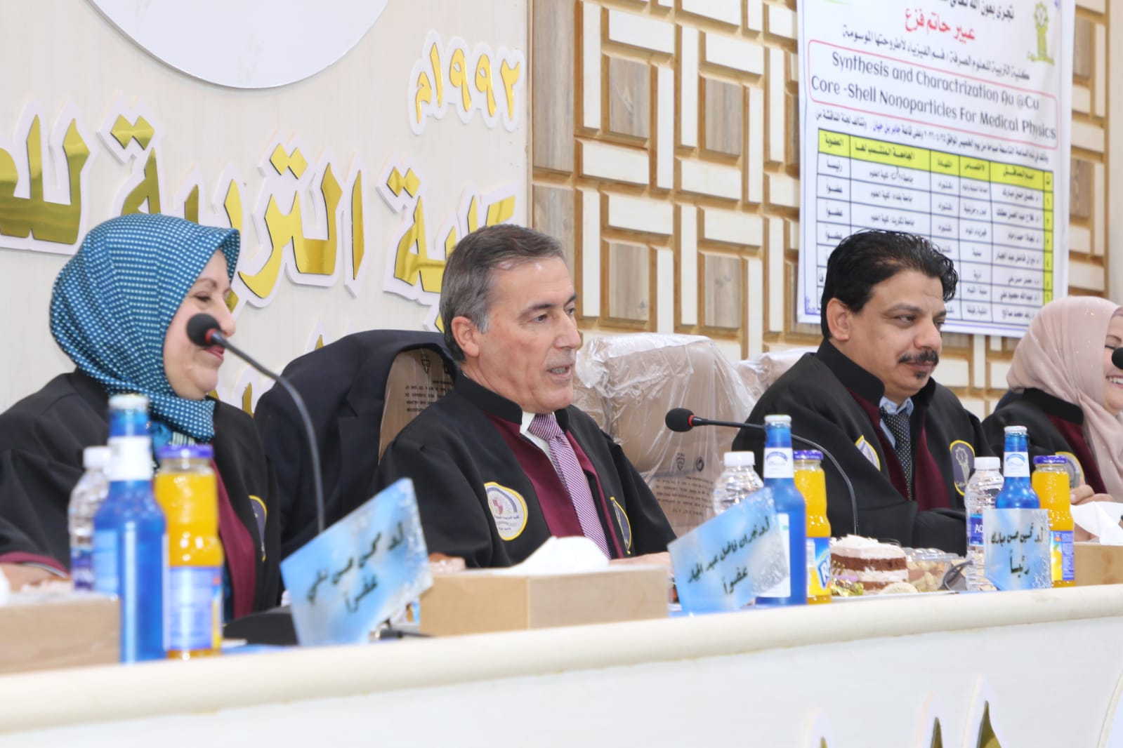 حضر بعدها رئيس الجامعة المناقشة وبارك للطالبة جهودها في هذه الاطروحة واشاد بالملاحظات العلمية للجنة المناقشة متمنيا الموفقية للجميع.