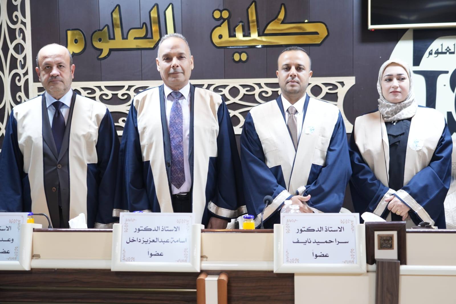 وفي ختام المناقشة أناب السيد عميد كلية العلوم الاستاذ الدكتور عبدالخالق علوان محيميد عن السيد رئيس الجامعة بتكريم