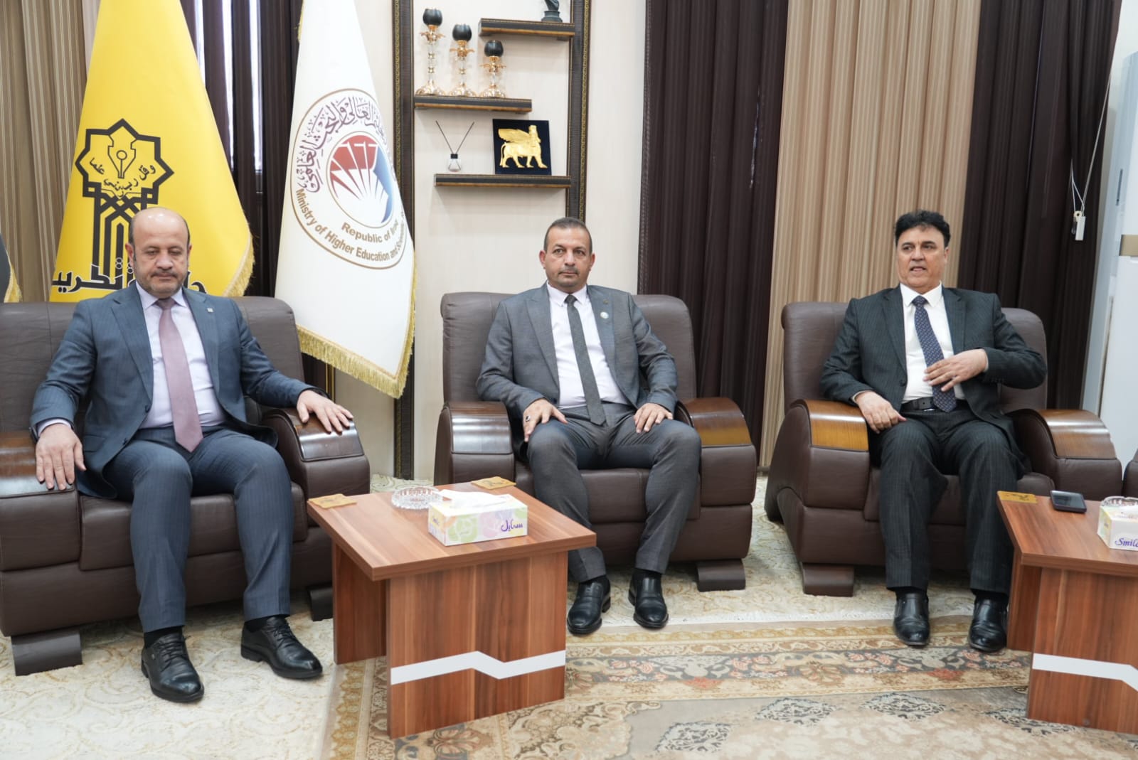 وفي سياق متصل استقبل الاستاذ الدكتور وعد محمود رئيس جامعة تكريت في مكتبه الاستاذ الدكتور وضاح عامر حاتم رئيس الجامعة التقنية الوسطى والذي شارك بصفته عضوا ومشرفا في مناقشة اطروحة الدكتوراه بكلية الهندسة حيث تم تكريمه بكتاب شكر وتقدير لجهوده المبذولة في هذه اللجنة وتجشمه عناء السفر، وتكريم وعدد من السادة المناقشين.