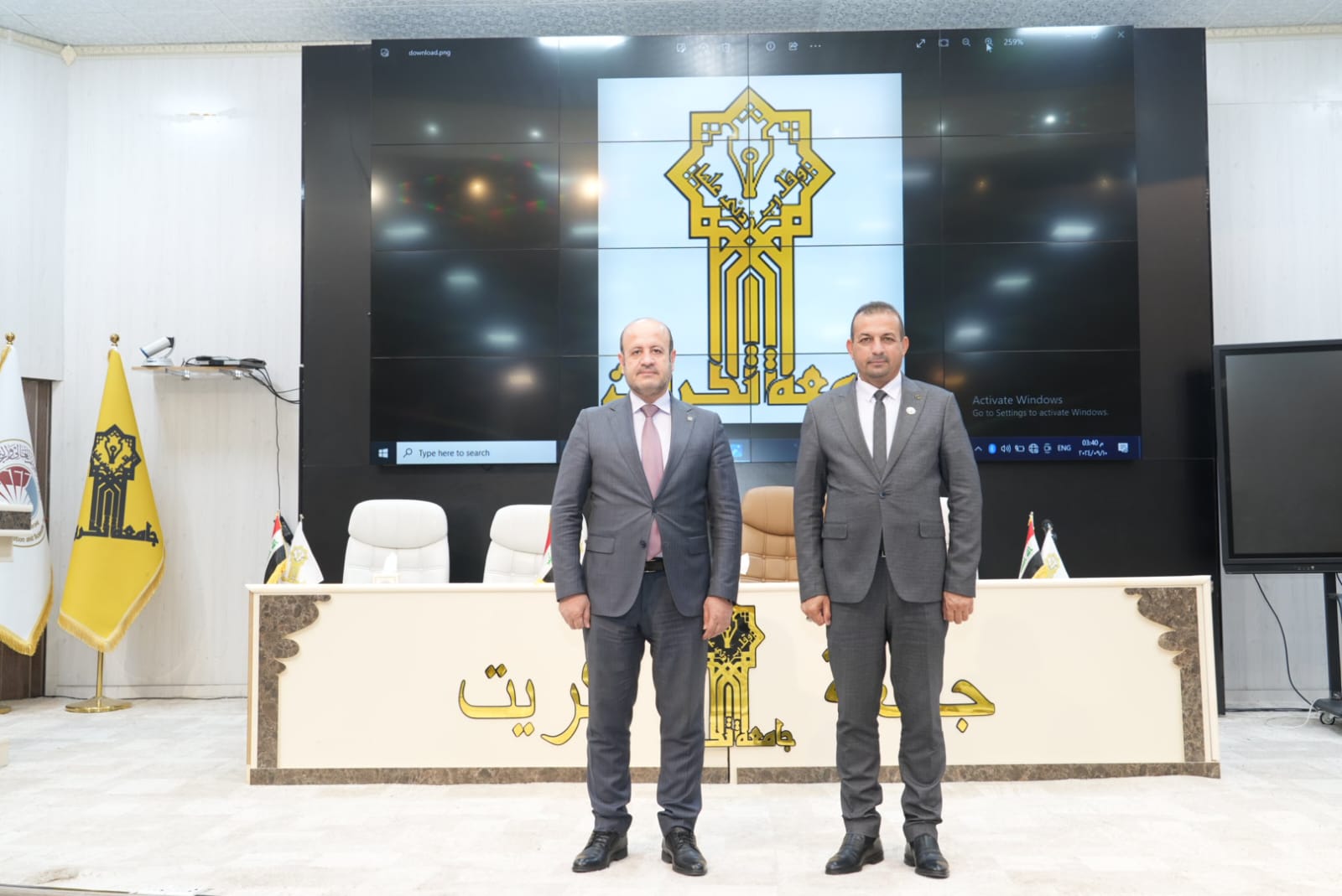 ضمن النهج المستمر لرئيس الجامعة في المشاركة وحضوره الشخصي والفاعل في مناقشات الرسائل والاطاريح العلمية حضر الاستاذ الدكتور وعد محمود رؤوف رئيس جامعة تكريت مناقشتين الاولى اطروحة دكتوراه بكلية الهندسة للطالبة (نضال عدنان جاسم) والثانية مناقشة رسالة ماجستير بكلية الادارة والاقتصاد للطالبة (رشا عبدالعزيز البدري)