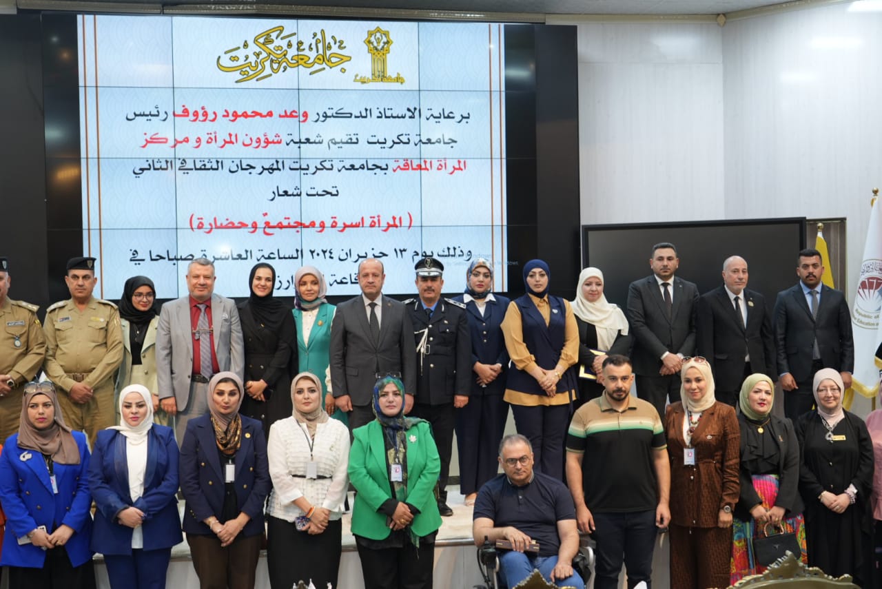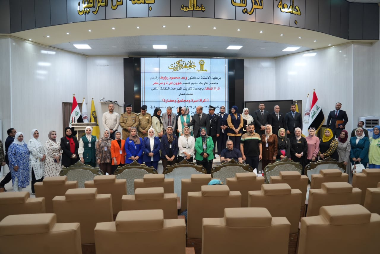 وبحضور مساعدي رئيس الجامعة للشؤون الادارية الاستاذ المساعد الدكتور فؤاد فرحان حسين والعلمية الاستاذ الدكتور حسن حسين ابراهيم وعدد من السادة العمداء واساتذة وطلبة الجامعة المهرجان الثقافي الثاني تحت شعار (المرأة اسرة ومجتمع وحضارة) افتتحت فعاليات المهرجان الذي احتضنته قاعة الخوارزمي بالجامعة بعد آي من الذكر الحكيم والنشيد الوطني بكلمة للسيد رئيس الجامعة اكد فيها بعد الترحيب بالحاضرين على اهمية اقامة هذا المهرجان والذي يعكس اهتمام جامعة تكريت والتزامها بتعزيز دور المرأة وتشجيعها على المشاركة الفاعلة الى جانب اخيها الرجل في مختلف النواحي لتحقيق التنمية والتقدم في المجتمع واثنى على دور شعبة شؤون المرأة في الجامعة التي انبرت بجدارة لهذا الدور
