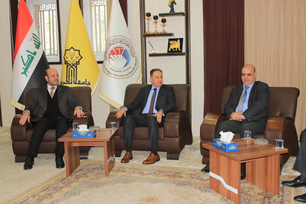 تثبيتا لنهجها في فتح افاق التعاون العلمي والاكاديمي المشترك مع الجامعات والمؤسسات العلمية والاكاديمية والمؤسسات والدوائر الحكومية بما يخدم ويحقق المصلحة العامة استقبل الاستاذ الدكتور وعد محمود رؤوف رئيس جامعة تكريت في مكتبه الاستاذ الدكتور حيدر طالب الامارة رئيس جامعة البيان يرافقه الاستاذ المساعد الدكتور عبدالجبار حسين علي مساعد رئيس جامعة البيان للشؤون العلمية والاستاذ المساعد الدكتور ثائر عبدالوهاب رئيس قسم العلاقات الثقافية في جامعة البيان.