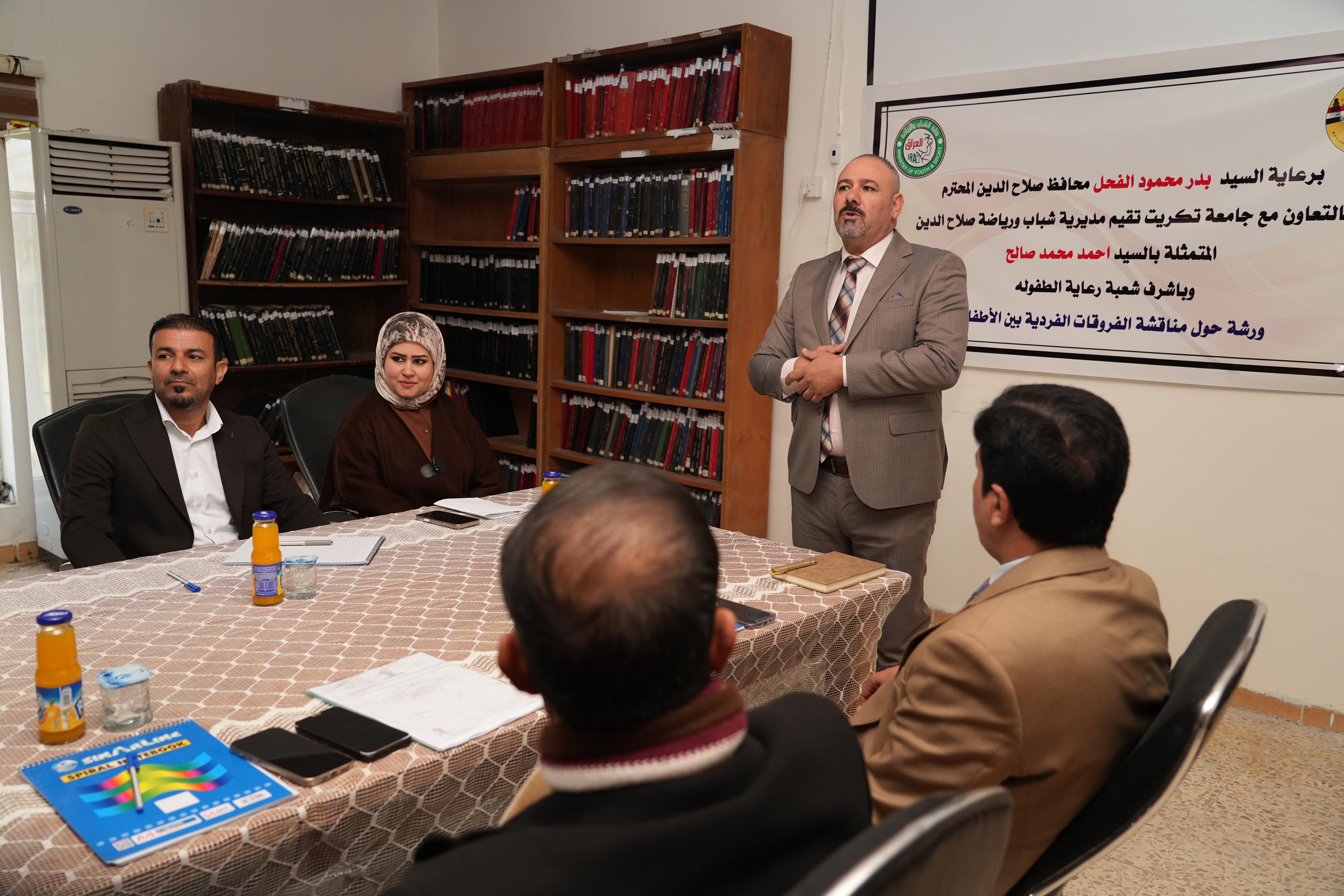 اقيمت وعلى قاعة المكتبة المركزية بجامعة تكريت ورشة عمل بعنوان "مناقشة الفروقات الفردية بين الأفراد". نظمت الورشة مديرية شباب ورياضة صلاح الدين، وبإشراف شعبة رعاية الطفولة بالتعاون مع جامعة تكريت، بحضور السيد أحمد محمد صالح مدير الشباب والرياضة في المحافظة والاستاذ الدكتور انور فارس عبد عميد كلية العلوم الاسلامية والاستاذ المساعد الدكتور عبدالله محمد طياوي عميد كلية التربية البدنية وعلوم الرياضة و عدد من الأكاديميين ذوي الاختصاص.
