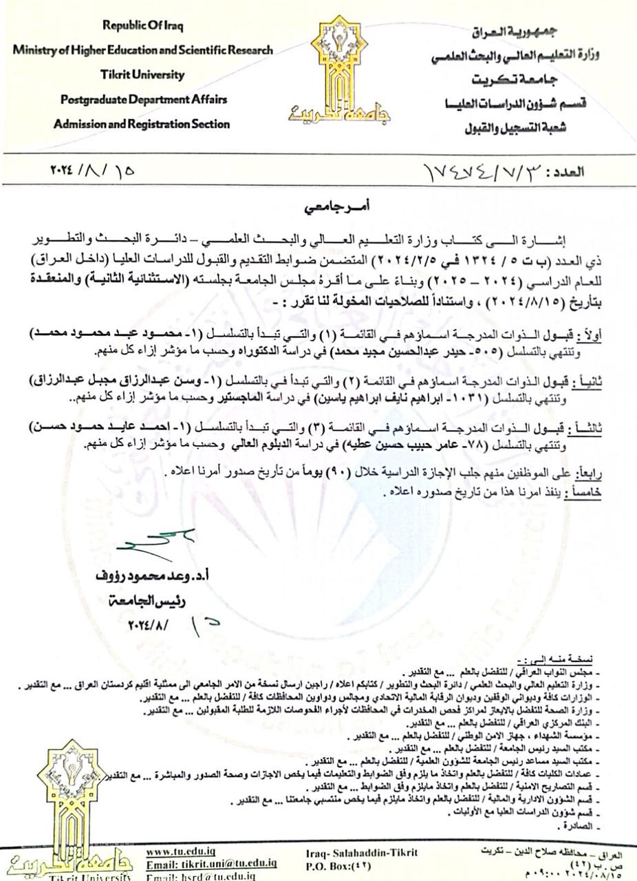 الامر الجامعي بالقبول النهائي في الدراسات العليا للعام الدراسي 2024-2025❇️