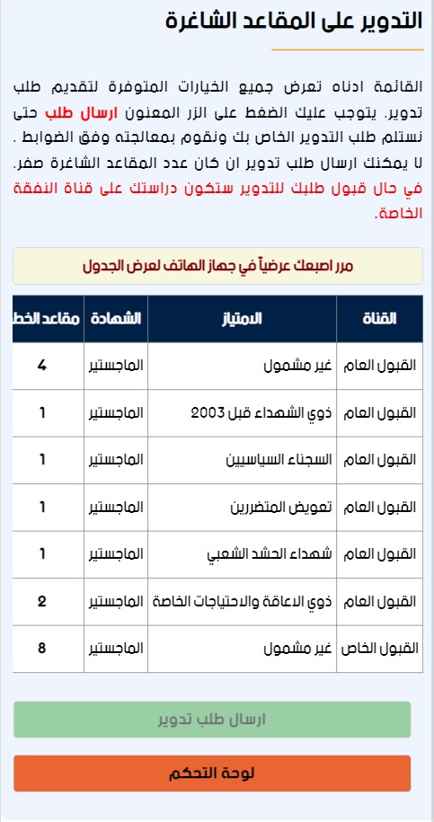 انطلقت خدمة ارسال طلب تدوير الى المقاعد الشاغرة في خطة القبول للعام الدراسي 2024-2025 والتي تسمح للمتقدمين على قنوات القبول العام والخاص والناجحين بالامتحان التنافسي بالتدوير لشغل مقعد شاغر سواء في العام او الخاص او الامتيازات. عند قبول التدوير سيكون المقعد المخصص للطالب المقبول على النفقة الخاصة ويتحمل اجور الدراسة , غير مسموح لذوي الامتيازات بارسال طلبات تدوير , المتقدمين الراسبين بالامتحان التنافسي غير مسموح لهم ارسال طلبات تدوير،وبعد ارسال طلب تدوير يرجى الانتظار لغاية 7-8 لمعرفة نتيجة معالجة طلب التدوير.