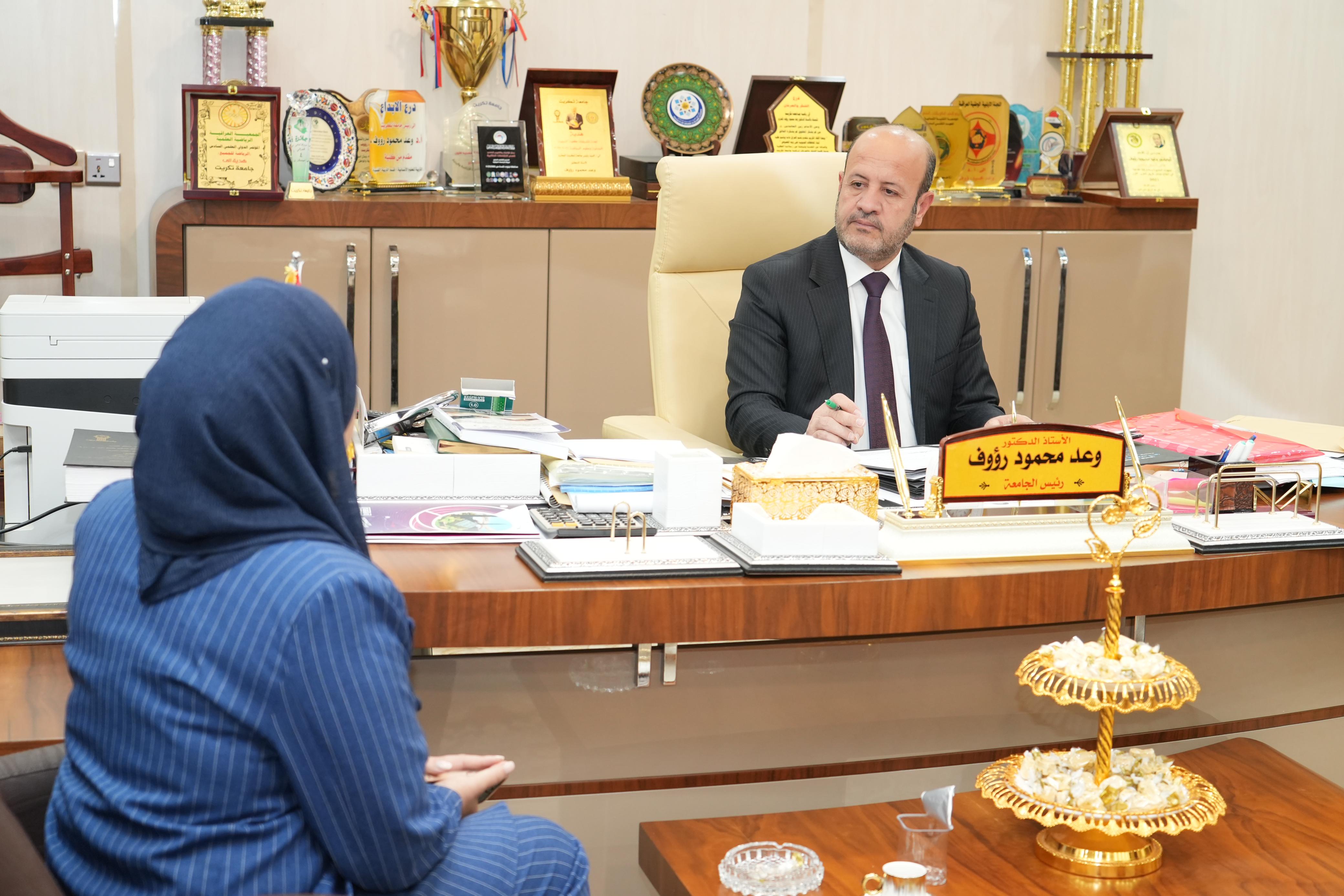 ضمن برنامج المقابلات الاسبوعي لرئيس الجامعة عبر استمارة المقابلات التي وضعتها شعبة شؤون المواطنين التقى الاستاذ الدكتور وعد محمود رؤوف رئيس جامعة تكريت اليوم الثلاثاء الموافق ٢/ ٧/ ٢٠٢٤ في مكتبه عدداً من الطلبة ومنتسبي الجامعة والمواطنين في اطار المتابعة الدائمة والمستمرة لاحتياجات منتسبي وطلبة الجامعة والمواطنين حيث استمع رئيس الجامعة الى احتياجاتهم ومشاكلهم ووجه الجهات ذات العلاقة بتذليل جميع العقبات وفق الاطر القانونية وضمن توجيهات وزارة التعليم العالي والبحث العلمي