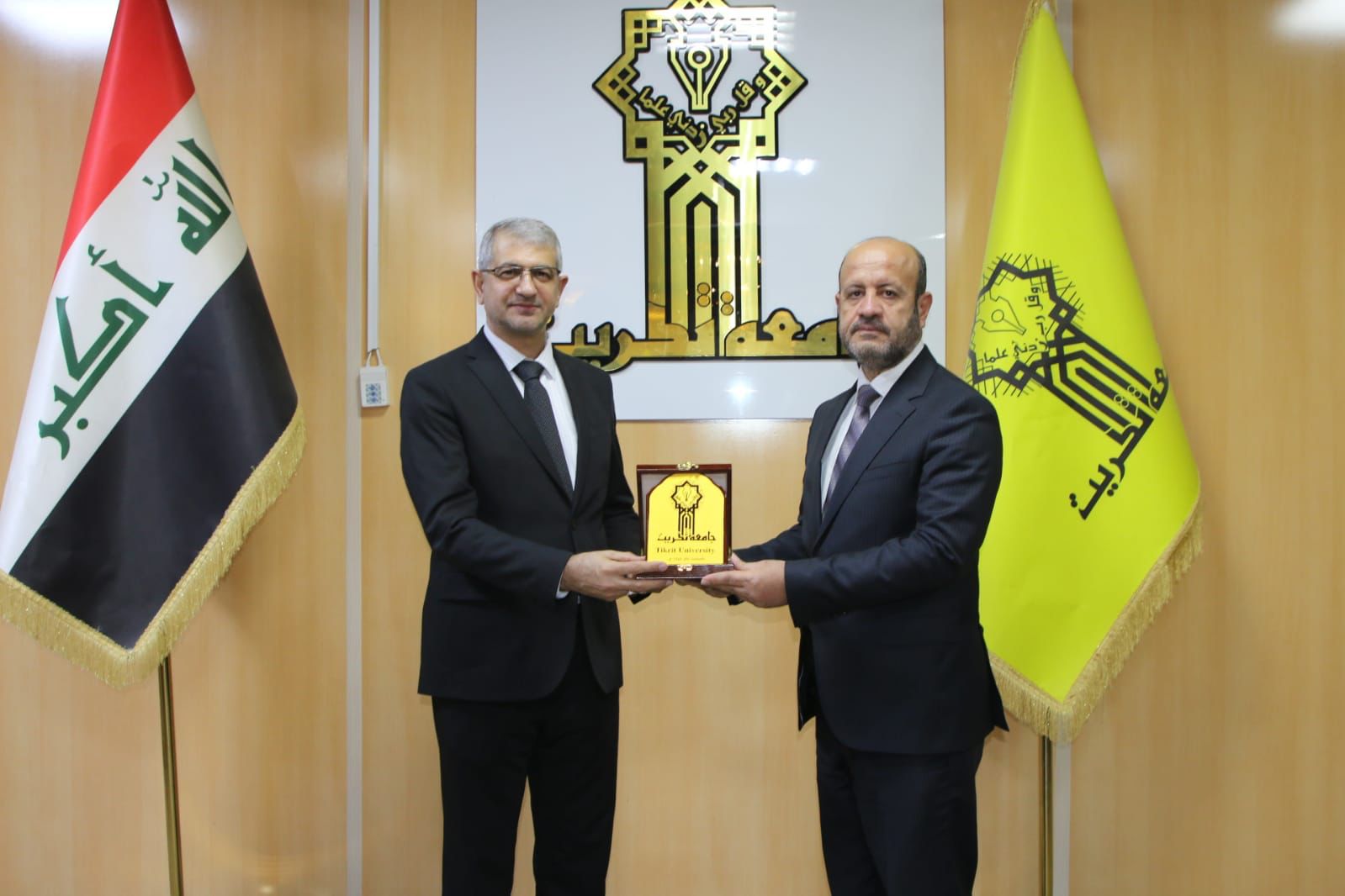 استقبل الاستاذ الدكتور وعد محمود رؤوف رئيس جامعة تكريت في مكتبه الاستاذ الدكتورة زينب عبد الحسين الملا السلطاني رئيس جامعة الزهراء عليها السلام وبعد الترحيب بالاستاذة الضيف تناول الطرفان المواضيع ذات الاهتمام المشترك بين الجامعتين واستمعت الضيف الى شرح عن واقع جامعة تكريت والتطور العلمي والاكاديمي والعمراني فيها، وشملت الزيارة جولة في اروقة الجامعة ضمت كلية طب الاسنان ومختبراتها والاطلاع على المستشفى التعليمي الخاص بها تم بعدها زيارة كلية الصيدلة ومختبراتها ثم الانتقال الى مطبعة الجامعة والاطلاع على عملها وزيارة الملعب الخاص بالجامعة وفي ختام اللقاء والزيارة تم توقيع مذكرة تعاون علمي مشترك بين الجامعتين وتبادل دروع الجامعتين. يذكر ان هذه الزيارة تأتي في اطار سعي الجامعة المستمر لفتح افاق التعاون مع الجامعات والمؤسسات العلمية والاكاديمية والمؤسسات الحكومية بما يخدم المصلحة العامة.