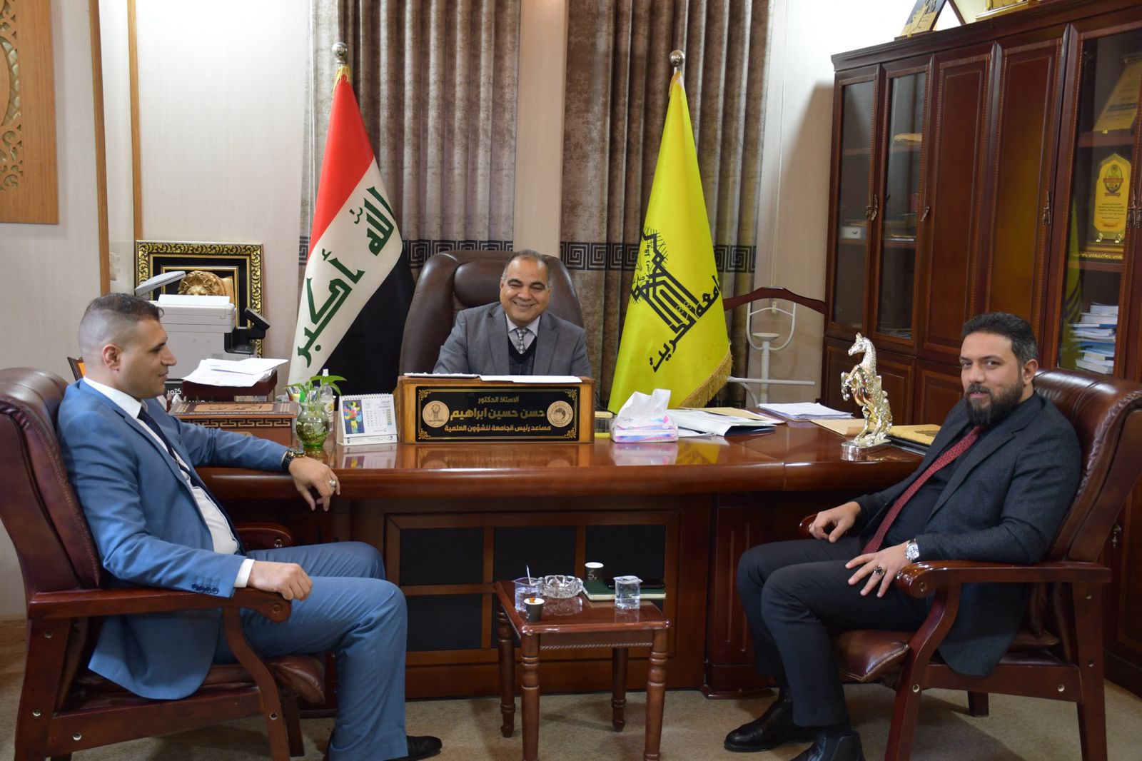 في اطار التعاون المشترك بين جامعة تكريت والمؤسسات الحكومية والعلمية ومؤسسات المجتمع استقبل الاستاذ الدكتور حسن حسين ابراهيم مساعد رئيس الجامعة للشؤون العلمية في مكتبه وفد العتبة الحسينية المكون من الدكتور حسن علي الوزني مسؤول ضمان الجودة في العتبة يرافقه الاستاذ احمد عباس الموسوي مسؤول العلاقات العلمية للعتبة الحسينية والذي يزور الجامعة لتقديم الدعوة للمشاركة بفعاليات المؤتمر الثاني بالتنمية والتطوير نرتقي والموسوم (فاعلية الجودة في تطوير الاداء المؤسسي) والذي ستعقد فعالياته برعاية العتبة الحسينية المقدسة وجامعة وارث الانبياء وكلية العلوم الاسلامية وقسم تطوير الموارد البشرية التابع للعتبة الحسينية. وسيتناول عدة محاور هي الدراسات الاسلامية والدراسات التنموية والدراسات الادارية والدراسات الاقتصادية بالاضافة الى الدراسات السياسية والقانونية.