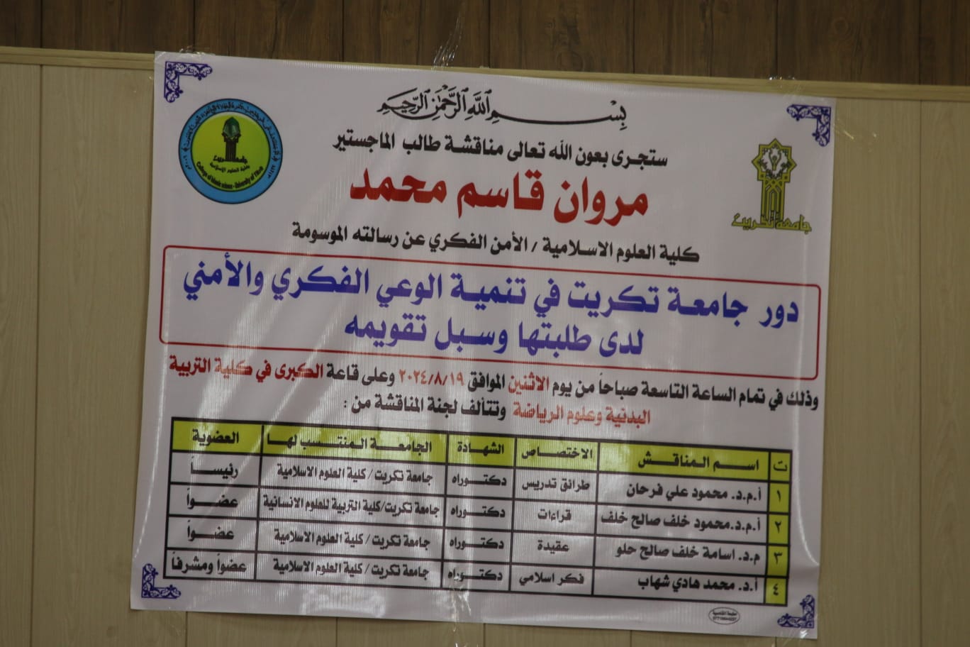 (دور جامعة تكريت في تنمية الوعي الفكري والأمني لدى طلبتها وسبل تقويمه) فيما كانت المناقشة الثالثة لطالب الماجستير صالح احمد داشان سایر من كلية التربية للعلوم الانسانية