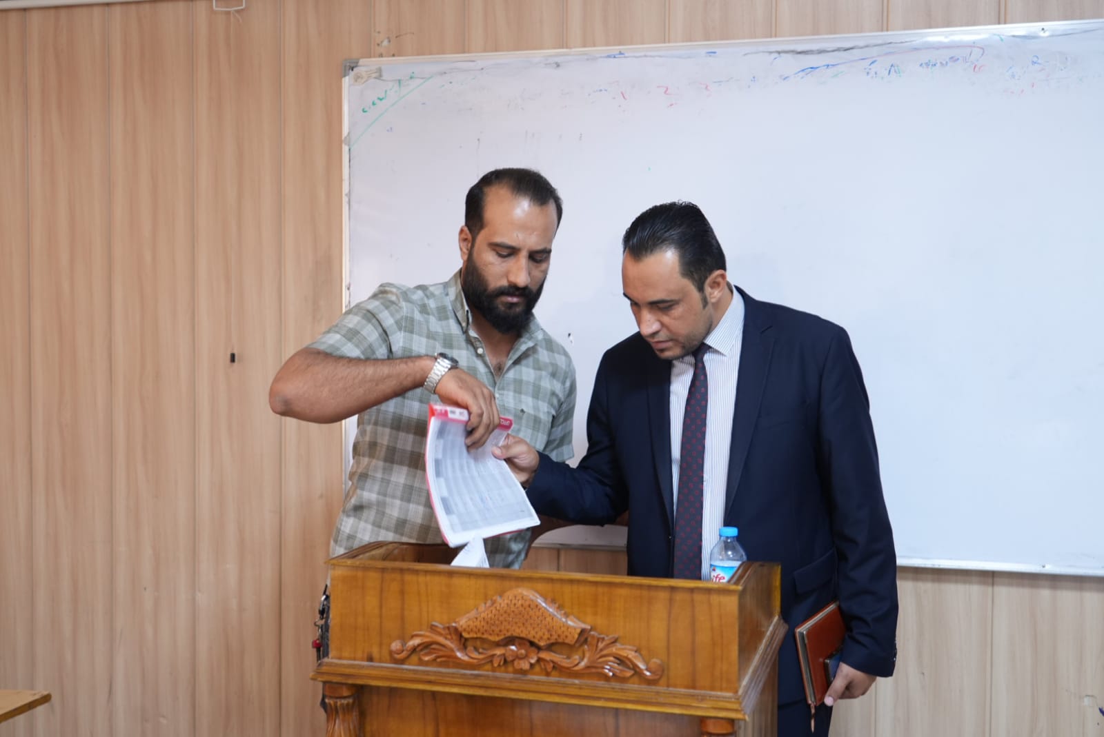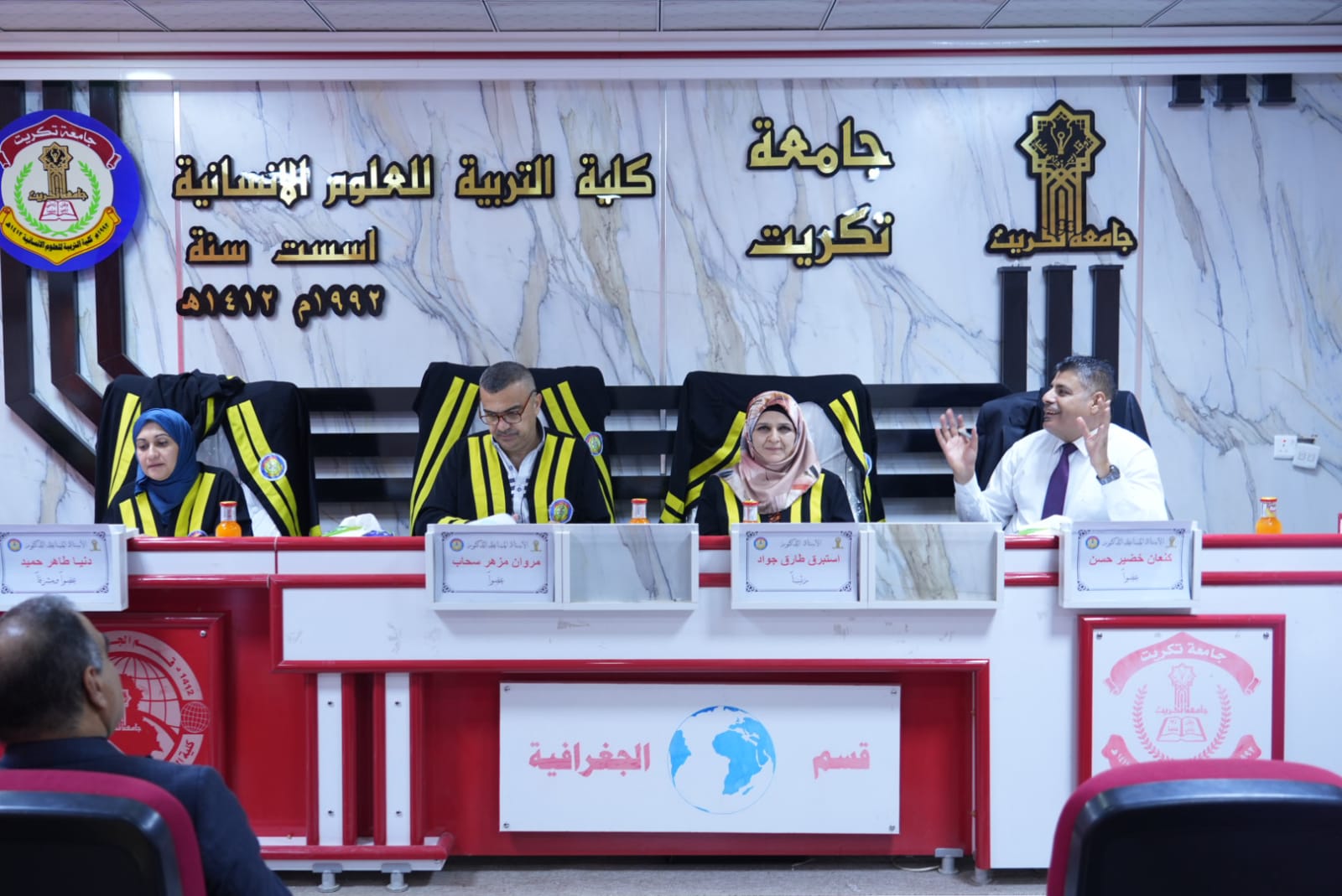 تنفيذا لتوجيهات الاستاذ الدكتور وعد محمود رؤوف رئيس جامعة تكريت وضمن الجولات التفقدية والمتابعات المستمرة لكليات واقسام ومفاصل الجامعة حضر الاستاذ المساعد الدكتور حسن حسين ابراهيم مساعد رئيس الجامعة للشؤون العلمية مناقشة رسالتي ماجستير الاولى للطالبة بدور عباس احمد عبد الله الجميلي من قسم التربية الفنية والثانية للطالبة هدى جاسم محمد كلية التربية للعلوم الانسانية قسم اللغة الانكليزية