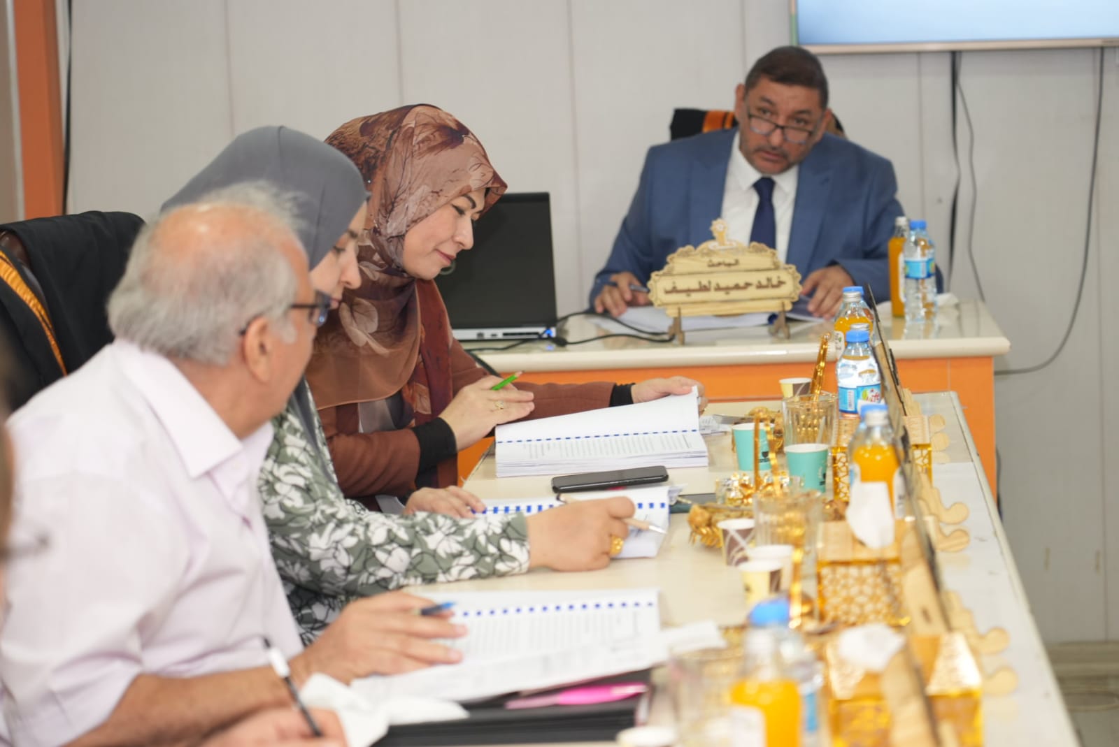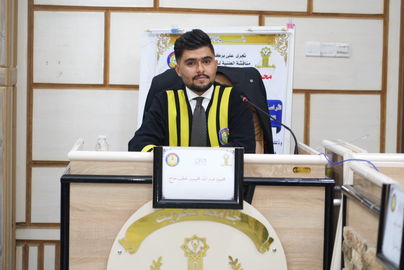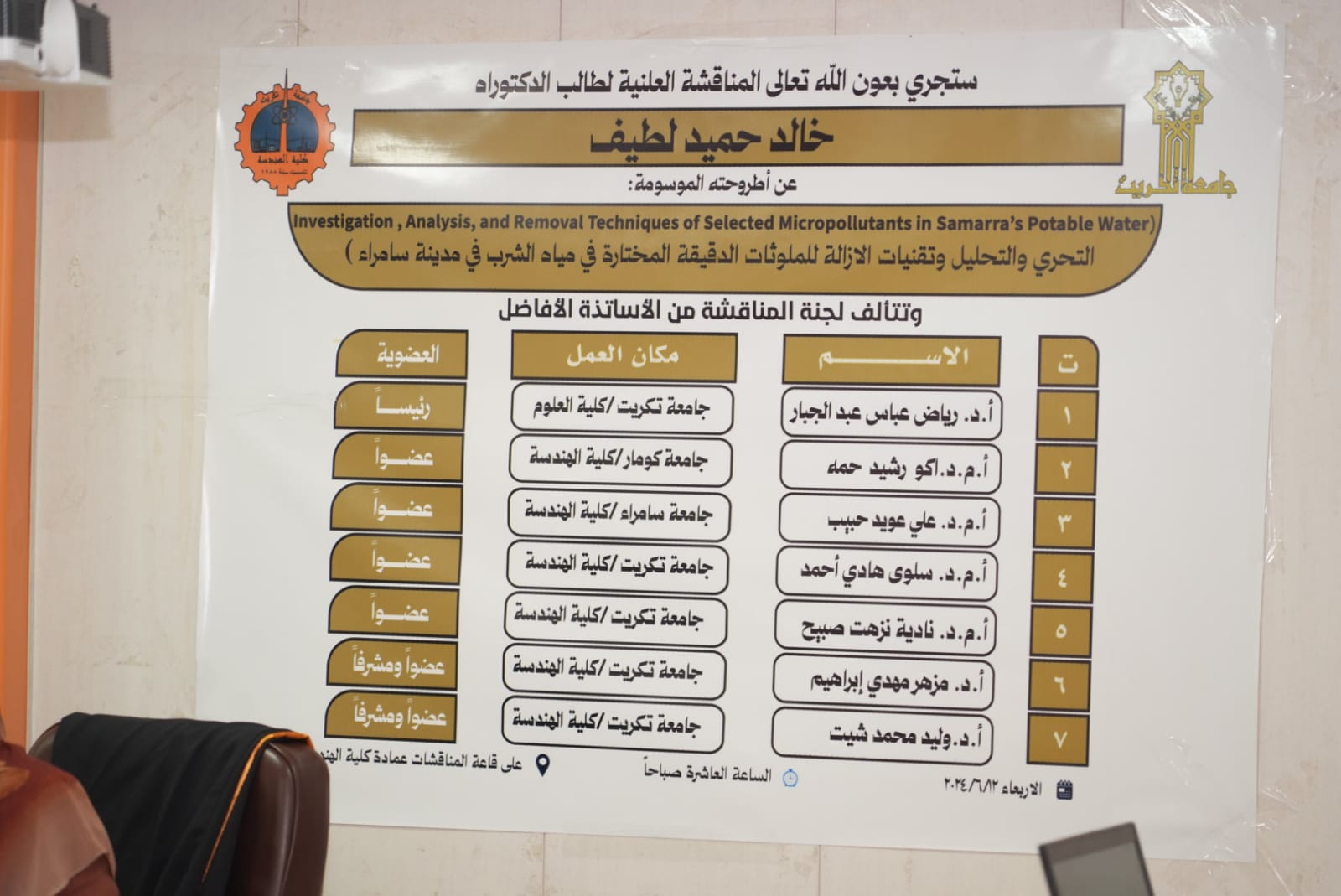 تنفيذا لتوجيهات الاستاذ الدكتور وعد محمود رؤوف رئيس جامعة تكريت وضمن الجولات التفقدية والمتابعة المستمرة لكليات واقسام ومفاصل الجامعة حضر الاستاذ الدكتور حسن حسين ابراهيم مساعد رئيس الجامعة للشؤون العلمية والاستاذ الدكتور فؤاد فرحان حسين مساعد رئيس الجامعة للشؤون الادارية مناقشة رسالة ماجستير في كلية التربية للعلوم الانسانية للطالب محمود عبدالله محيميد من قسم العلوم التربوية والنفسية والموسومة (اثر استراتيجية المحاكمة العقلية في تحصيل طلاب الصف الخامس الادبي في مادة الفلسفة وعلم النفس وتنمية قيمهم الاخلاقية) حضر المساعد العلمي بعدها مناقشة اطروحة دكتوراه للطالب خالد حميد لطيف من كلية الهندسة