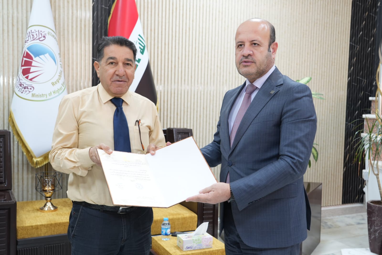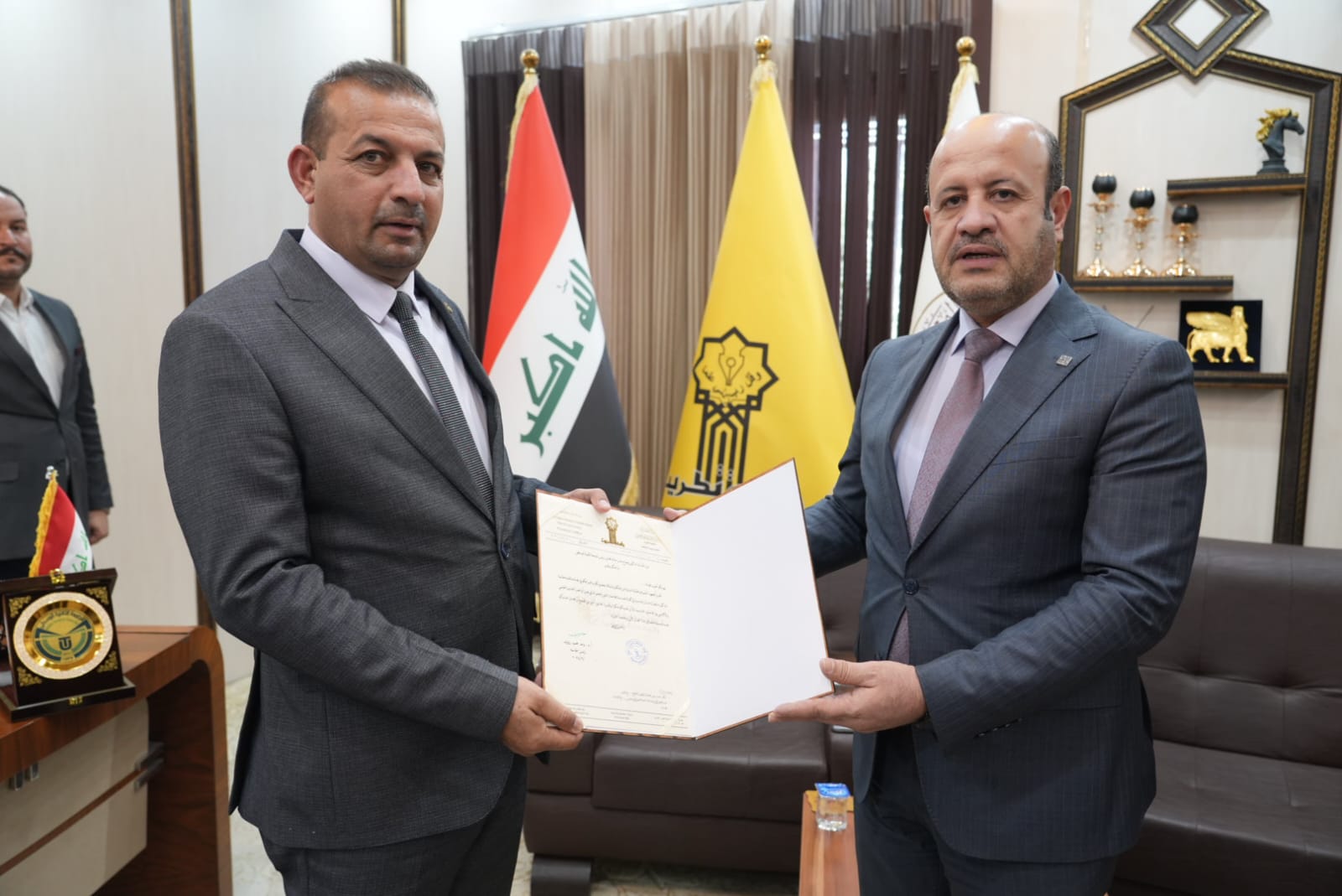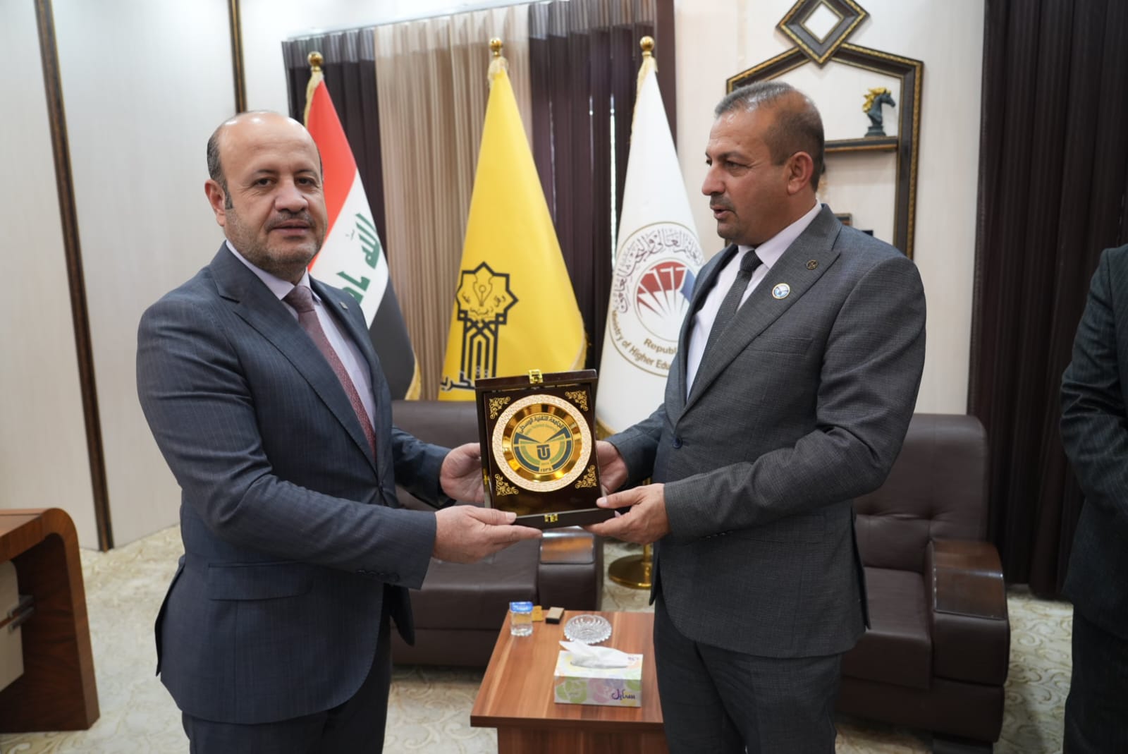 وفي سياق متصل استقبل الاستاذ الدكتور وعد محمود رئيس جامعة تكريت في مكتبه الاستاذ الدكتور وضاح عامر حاتم رئيس الجامعة التقنية الوسطى والذي شارك بصفته عضوا ومشرفا في مناقشة اطروحة الدكتوراه بكلية الهندسة حيث تم تكريمه بكتاب شكر وتقدير لجهوده المبذولة في هذه اللجنة وتجشمه عناء السفر، وتكريم وعدد من السادة المناقشين.