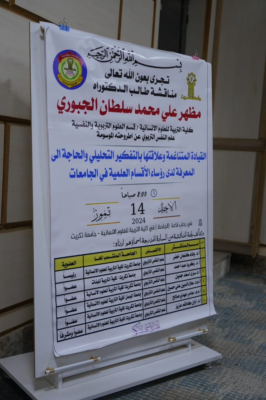 حضر الاستاذ الدكتور وعد محمود رؤوف رئيس جامعة تكريت مناقشة اطروحة الدكتوراه في كلية التربية للعلوم الانسانية للطالب (مظهر علي محمد سلطان الجبوري) من قسم العلوم التربوية والنفسية/ علم النفس التربوي عن اطروحته الموسومة (القيادة المتناغمة وعلاقتها بالتفكير التحليلي والحاجة الى المعرفة لدى رؤساء الأقسام العلمية في الجامعات) وعبر السيد رئيس الجامعة عن سروره بحضور المناقشة بعد ان بارك للطالب المناقش مشددا على الاهتمام بالجودة من الجانب الاكاديمي والارتقاء بالرصانة في المناقشات العلمية. واثنى على دقة الملاحظات العلمية التي طرحتها لجنة المناقشة وصوابها مباركاً للجهود المبذولة في هذه الاطروحة من قبل الطالبة ولجنة المناقشة.