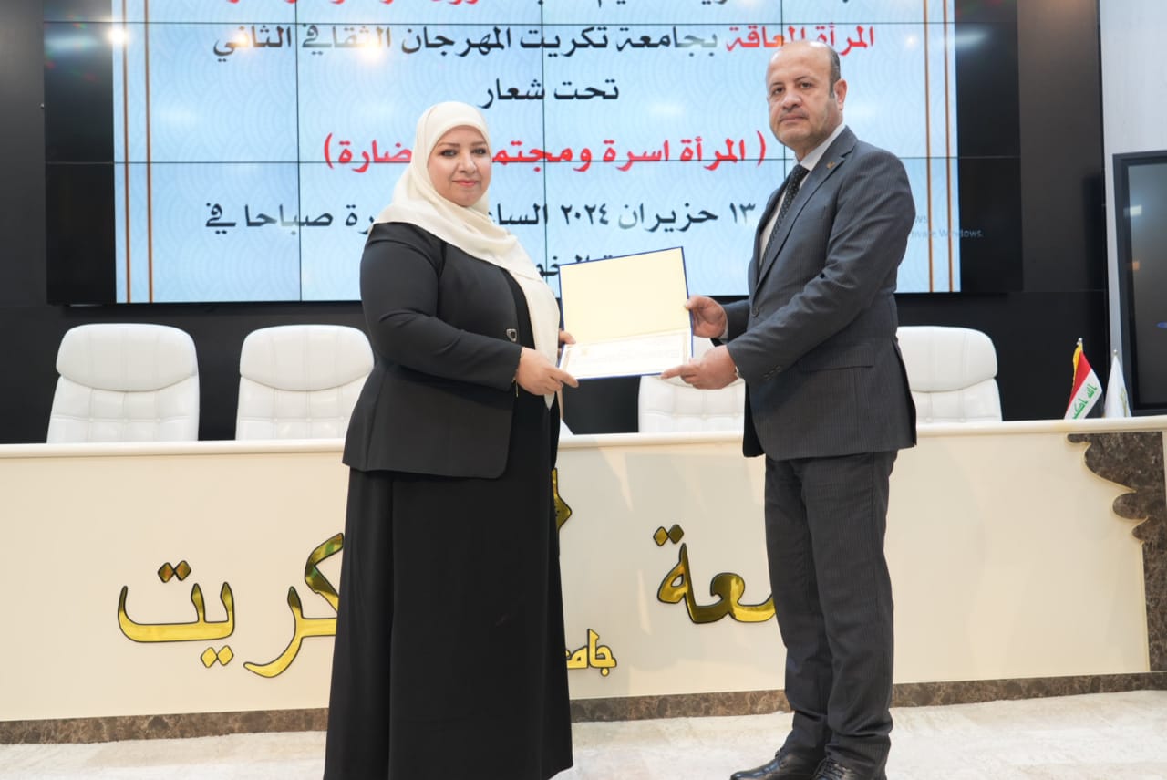 وبحضور مساعدي رئيس الجامعة للشؤون الادارية الاستاذ المساعد الدكتور فؤاد فرحان حسين والعلمية الاستاذ الدكتور حسن حسين ابراهيم وعدد من السادة العمداء واساتذة وطلبة الجامعة المهرجان الثقافي الثاني تحت شعار (المرأة اسرة ومجتمع وحضارة) افتتحت فعاليات المهرجان الذي احتضنته قاعة الخوارزمي بالجامعة بعد آي من الذكر الحكيم والنشيد الوطني بكلمة للسيد رئيس الجامعة اكد فيها بعد الترحيب بالحاضرين على اهمية اقامة هذا المهرجان والذي يعكس اهتمام جامعة تكريت والتزامها بتعزيز دور المرأة وتشجيعها على المشاركة الفاعلة الى جانب اخيها الرجل في مختلف النواحي لتحقيق التنمية والتقدم في المجتمع واثنى على دور شعبة شؤون المرأة في الجامعة التي انبرت بجدارة لهذا الدور